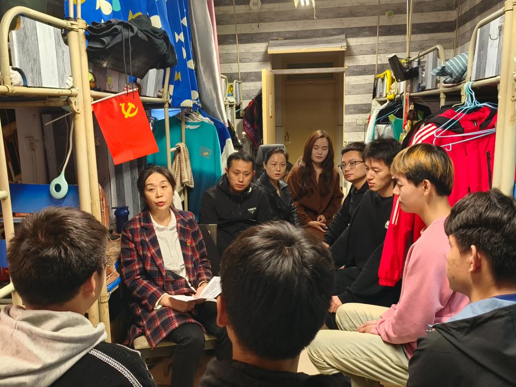 10月28日下午,体育学院党总支书记李春兰,党总支副书记闵雄飞,学工办主任朱颖妮,团总支部书记王斌和2022级辅导员李欣泽深入到包联的七号公寓楼宣讲党的二十大精神,开展党建进公寓活动。