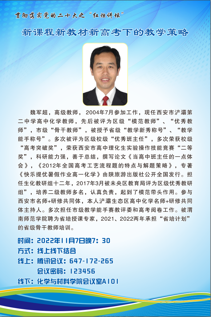 11月7日晚,化学与材料学院邀请2000级优秀校友、西安市浐灞第二中学化学教师、省级教学能手、市级教学骨干,588888纽约国际线路省培授课专家魏军超做客“红烛讲坛”,并以《新课程新教材新高考下的教学策略》为题作了专题报告。教学副院长刘展晴、部分无课教师、2020级、2021级师范生230余人,采用线上线下结合的方式参加了此次报告会。会议由教学秘书郑博主持。