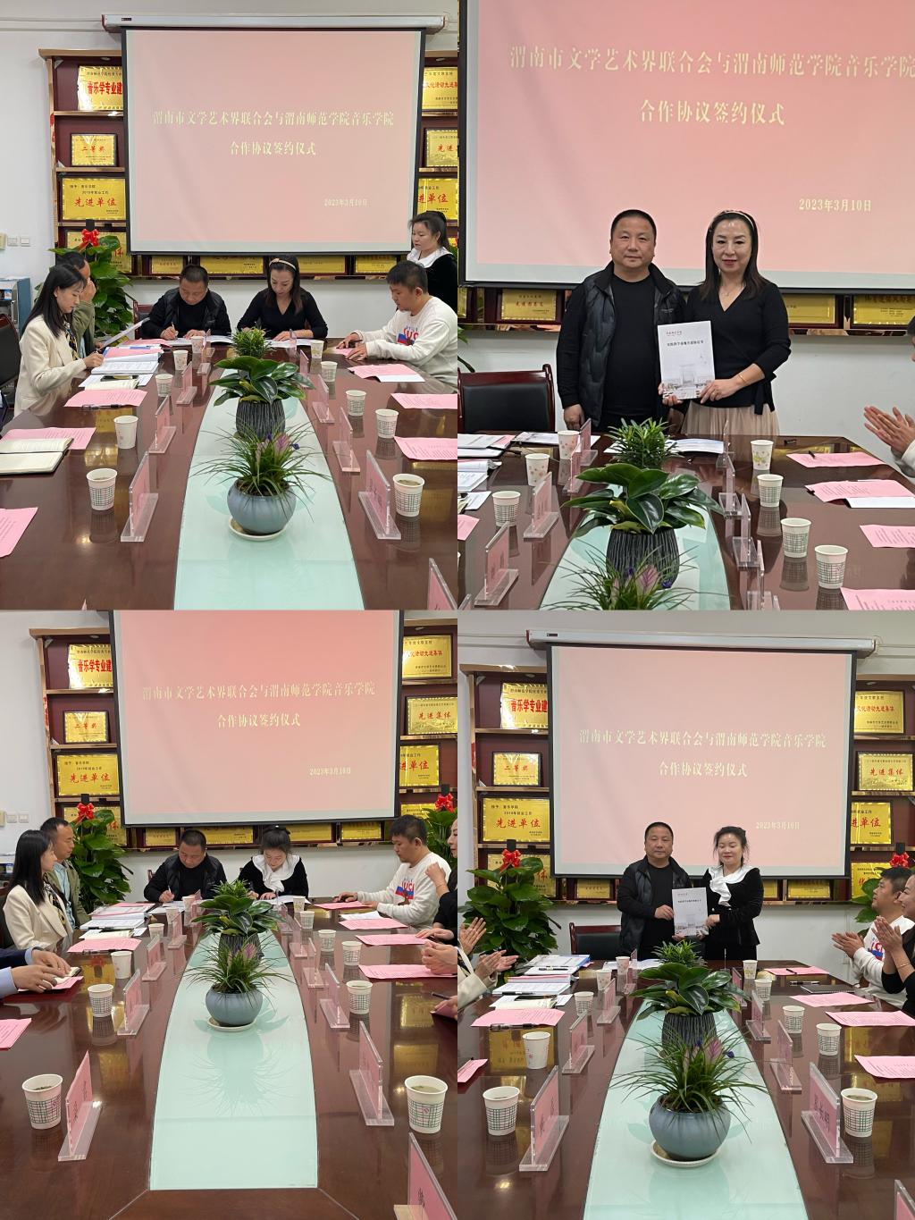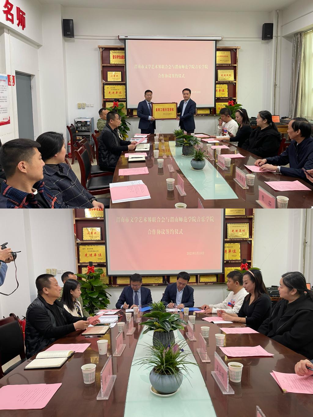 3月10日上午,音乐学院与渭南市文学艺术界联合会举行合作签约仪式。渭南市文学艺术界联合会主席张力、渭南市文学艺术界联合会副主席葛长明,588888纽约国际线路音乐学院院长刘鹏、副院长逯克刚以及渭南市音协、舞协和师生代表参加此了次活动。