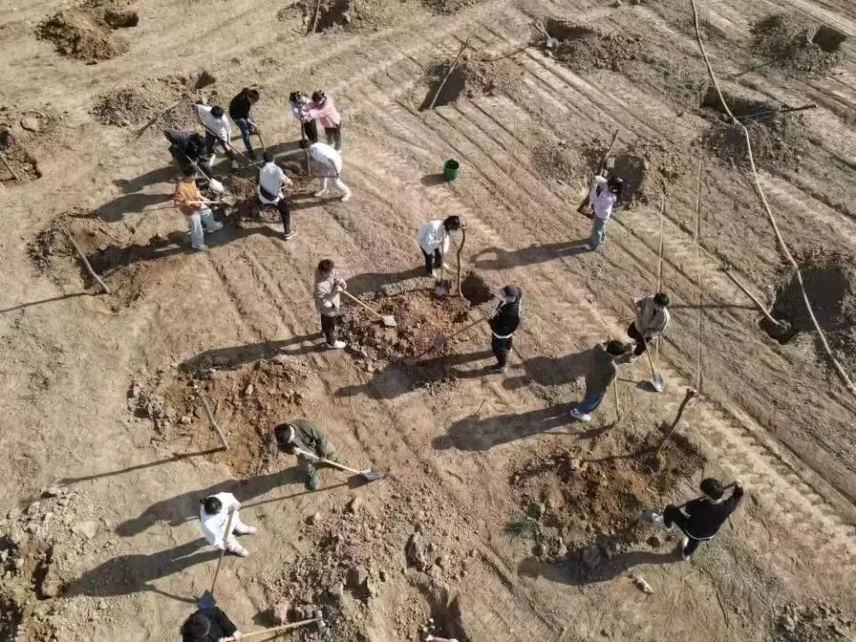 植树现场,学院领导带领参与植树的师生进行分工协作,大家热情洋溢、干劲十足。两三人一组互相配合,挖坑、植树、浇水、覆土、固定、手起锄落、放苗回填、提水浇灌……整个过程一丝不苟;各个环节衔接有序、配合默契,齐心合力栽下一棵棵树苗。经过一番辛勤的劳动,棵棵新树昂首挺立,为校园再添新绿。