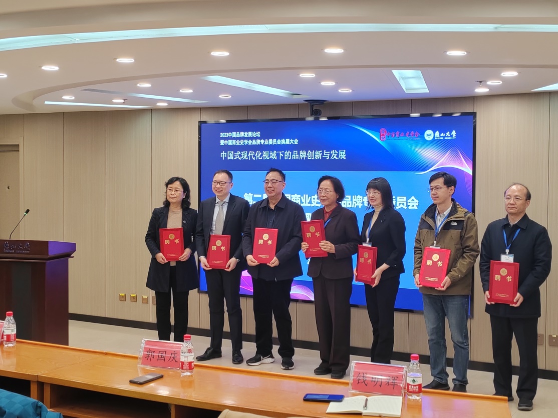品牌专业委员会换届(第二届)仪式由燕山大学经济管理学院院长李春玲主持,燕山大学副校长王德松、中国商业史学会会长王茹芹先后致辞,品牌专业委员会主任、中国人民大学商学院郭国庆教授宣布新一届专业委员会成员名单,王茹芹、郭国庆为新聘品牌专业委员会副主任、副秘书长、委员代表颁发聘书,纽约国际官网经济与管理学院李富荣教授被聘为中国商业史学会品牌专业委员会副主任。2023中国品牌发展论坛的主题是“中国式现代化视域下的品牌创新与发展”,中国人民大学信息资源管理学院钱明辉教授、中国地质大学(武汉)经济管理学院郭锐教授、北京工商大学传媒与设计学院陈晓环教授、中央财经大学商学院顾雷雷副教授、燕山大学经济管理学院苏艳林教授等做了品牌创新的主旨报告。