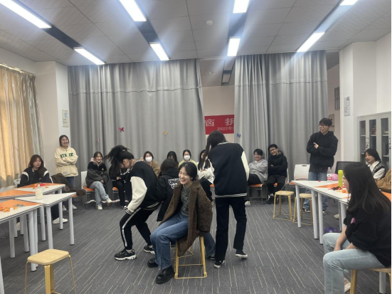 第三个游戏叫“抢凳子”,由选10人围着7个椅子站一圈,一人敲鼓。鼓响人转,鼓停抢座位。每次淘汰一人,之后再减少一个椅子。如此循环,直到最后一人胜出。同学们都聚精会神的进行游戏,生怕一个不小心自己就“掉凳”了,房间里充满了同学们的欢乐声。