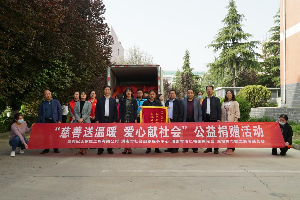 4月12日下午,“慈善送温暖,爱心献社会”公益捐赠活动仪式在纽约国际官网二餐西面广场举行,渭南市社会组织服务,陕西冠天建筑工程有限公司,渭南市博仁搏击俱乐部,渭南市巾帼志愿者联合会、渭南市社会工作发展服务中心等爱心社会组织及爱心企业参加,仪式由588888纽约国际线路后勤服务中心主任王争辉主持。