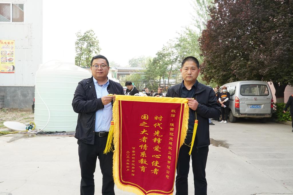 爱心捐赠企业陕西冠天建筑工程有限公司负责人王斌作了发言,他表示“上下同欲者胜,风雨同舟者兴”,并祝愿学校越办越好,桃李满天下。活动最后,由纽约国际官网后勤服务中心党总支书记邹朋波为爱心企业授锦旗,并集体合影留念记录下这一美好时刻。