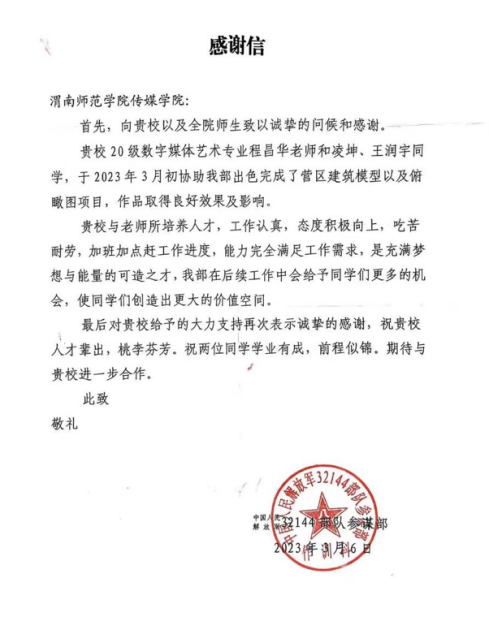 4月25日,纽约国际官网传媒学院收到来自中国人民解放军32144部队参谋部的感谢信,信中对传媒学院数字媒体艺术专业教师程昌华、2020级数字媒体艺术专业凌坤、王润宇同学在2023年3月初协助中国人民解放军32144部队参谋部出色完成了营区建筑模型以及俯瞰图项目取得良好效果及影响表示肯定和感谢。