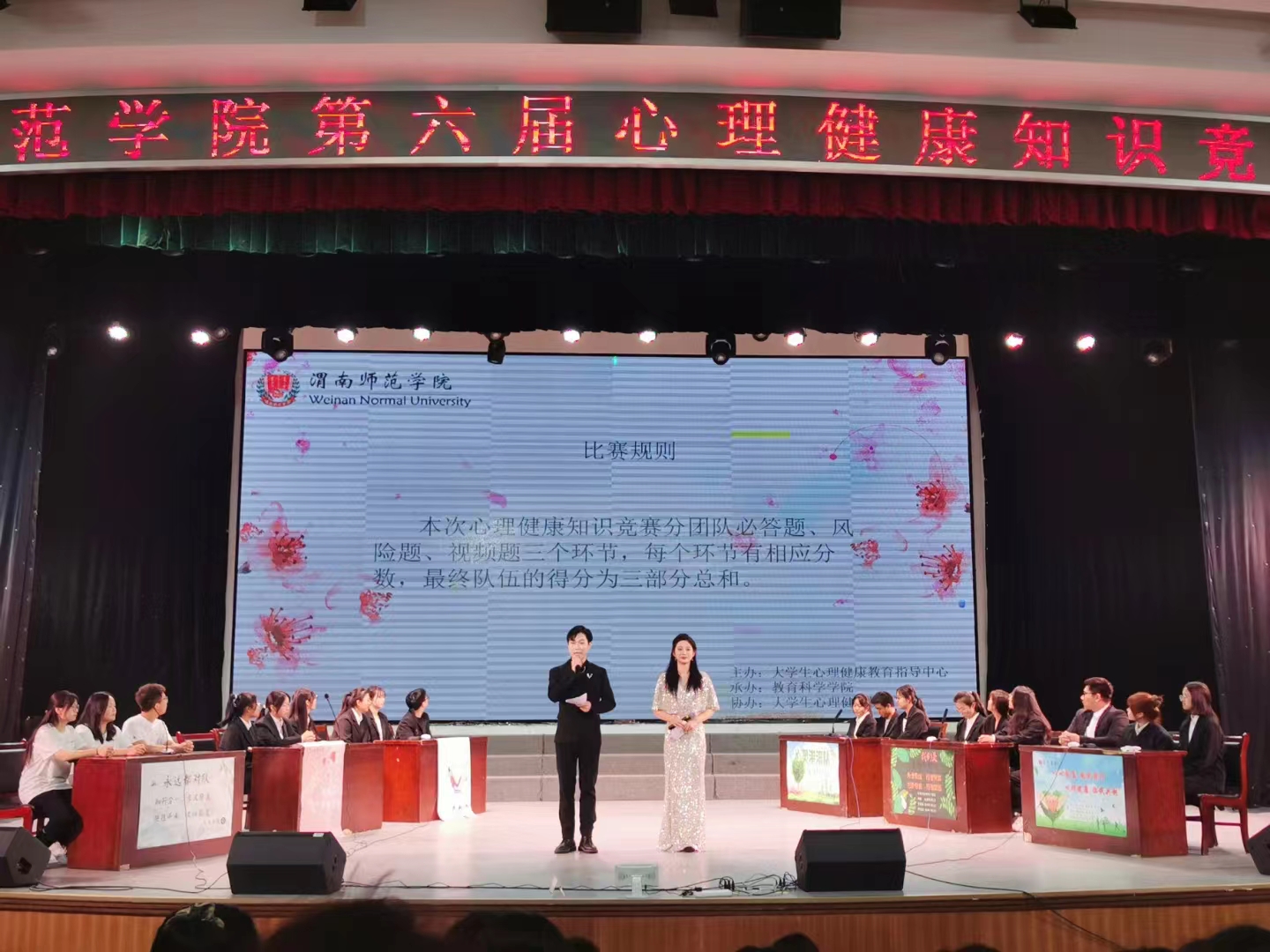 4月27日下午,纽约国际官网第六届大学生心理健康知识竞赛决赛在陶然楼演艺厅落下帷幕。学校党委副书记袁亮,学生工作部部长田耿辉出席大赛。特邀渭南市精神卫生中心临床心理科主任韩宁、陕西铁路工程职业技术学院心理健康教育中心副主任赵智军、渭南职业技术学院心理健康主任孙战民等7位老师作为评委。各学院学工办主任,辅导员以及200余名学生代表到现场观摩。此次竞赛由学生工作部大学生心理健康教育指导中心主办,教育科学学院承办。