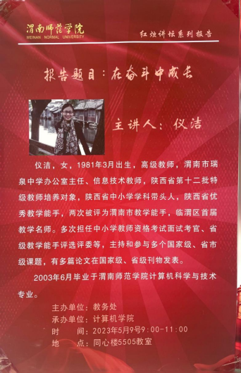 5月9日上午,计算机学院特邀2003届优秀校友、渭南市瑞泉中学办公室主任、省级优秀教学能手仪洁做了“在奋斗中成长”学术讲座,计算机学院院长杨方琦、副院长哈渭涛、教师代表以及学生代表参加讲座,讲座由杨方琦主持。