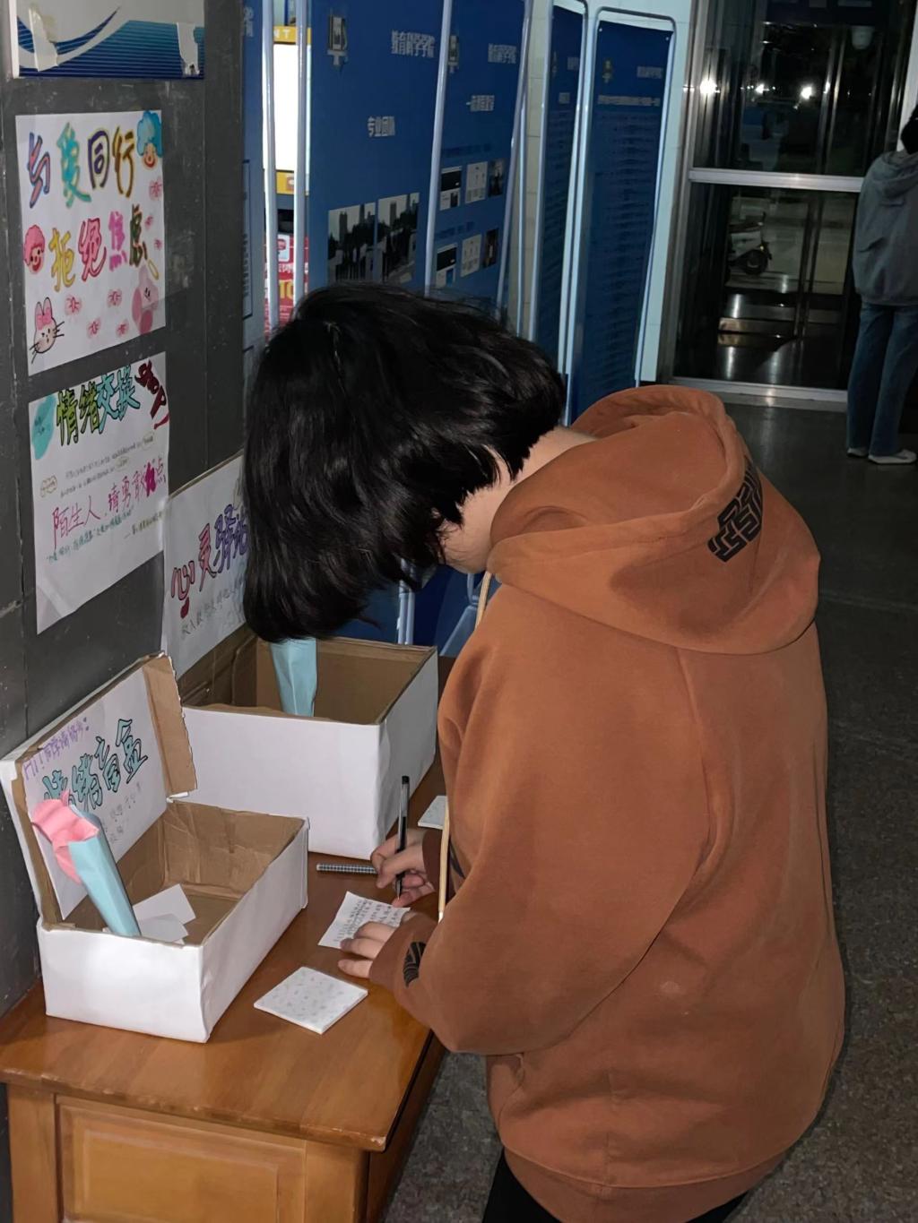 教育科学学院开展“与爱同行,拒绝焦虑”交换心情盲盒活动。活动中同学们在便签纸上写下自己的焦虑或烦恼,放入“垃圾桶”盲盒中,同时抽取他人的心情盲盒,在他人的留言下写上鼓励支持的话语,放入“充电”盲盒中。活动结束后由组织者整理盲盒中的纸条,对同学们给别人写的鼓励话语进行集中展示。