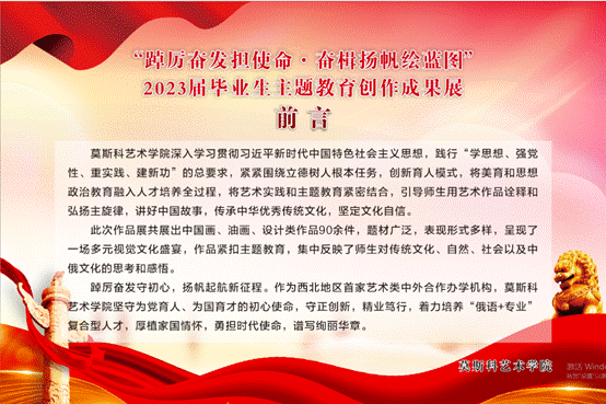 为了将艺术实践和主题教育紧密结合,引导师生用艺术作品诠释和弘扬主旋律,讲好中国故事,传承中华优秀传统文化,坚定文化自信。莫斯科艺术学院在逸夫实验楼一楼展厅举办“踔厉奋发担使命·奋楫扬帆绘蓝图”2023届毕业生主题教育创作成果展。展览持续至6月30日,面向公众开放。