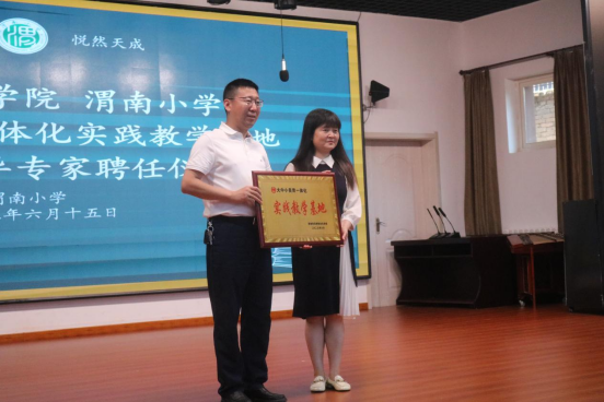 美育教育贯穿大中小学生培养全过程,为助力美育教育区域一体化协同发展,帮助、中小学提高美育水平,音乐学院与渭南小学携手成立大中小美育一体化实践教学基地。音乐学院院长刘鹏为渭南小学授牌。随后,渭南小学校长郗莉为音乐学院教师颁发校外指导专家聘书。