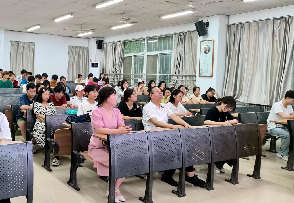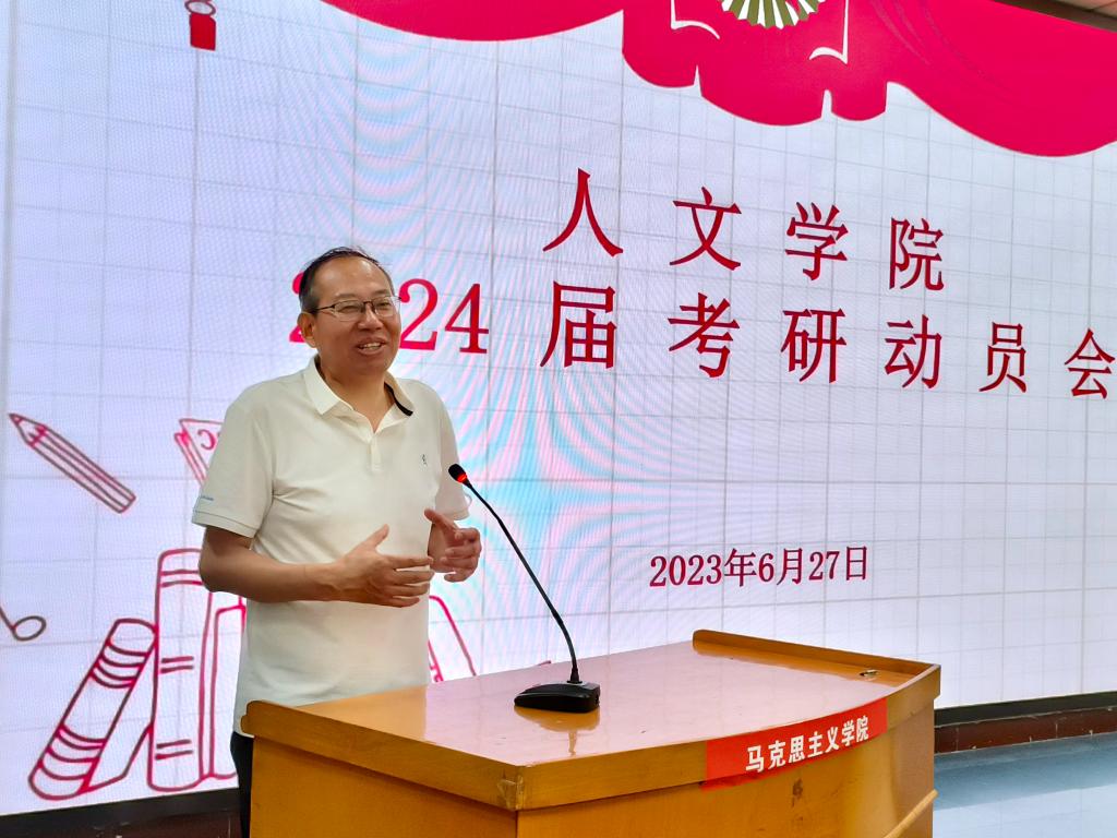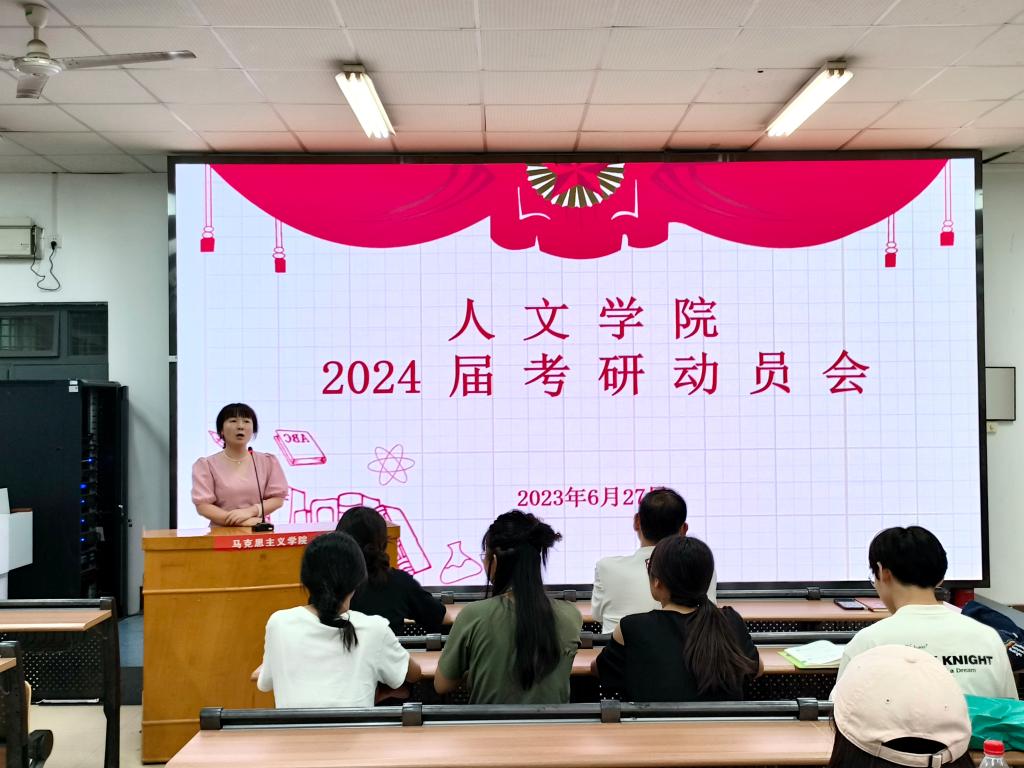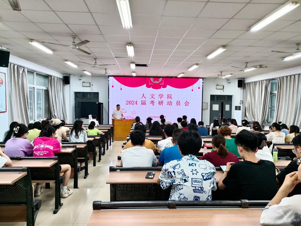6月27日下午,人文学院举行2024届考研学生动员加油会。该院院长赵前明,党总支副书记、副院长张晶以及2024届考研学生100余人参会,会议由团总支书记孟子祥主持。