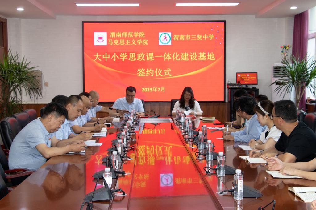 7月7日上午,马克思主义学院与渭南市三贤中学共建大中小学思政课一体化建设基地签约授牌仪式在三贤中学会议室举行。马克思主义学院院长张萍、副院长单剑峰、思政课教师代表孙百红、三贤中学党委书记刘刚、校长郭高峰、副校长赵宁及教师代表等参加了仪式。