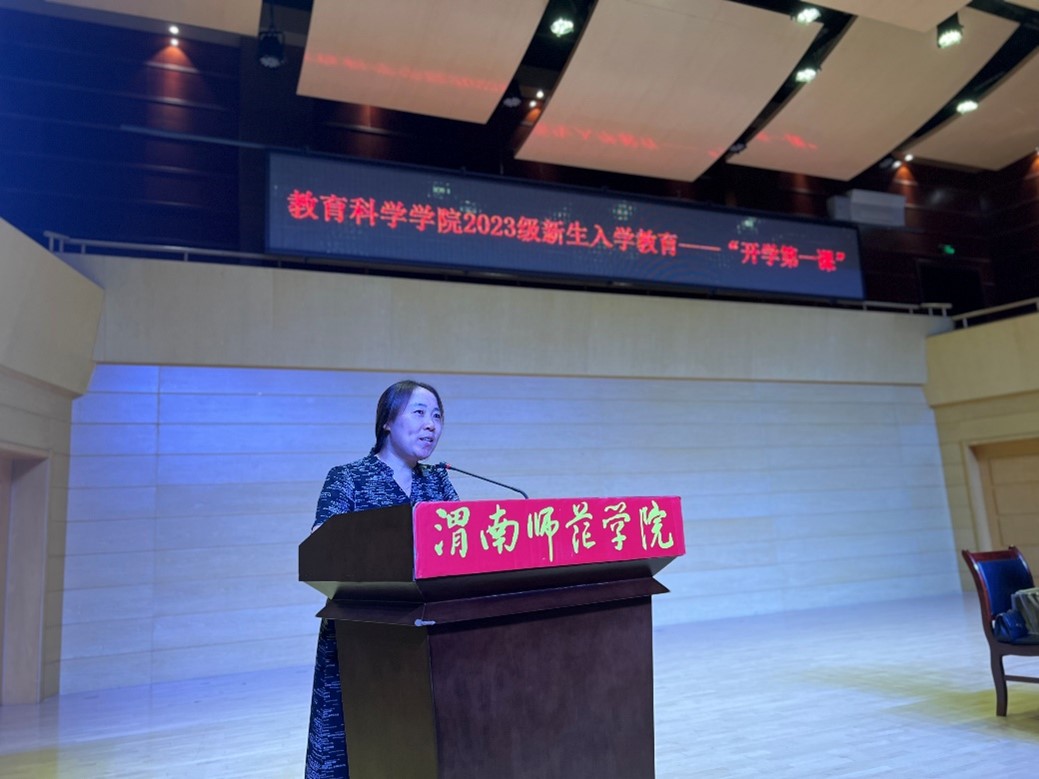 9月18日晚,教育科学学院在华金音乐厅组织2023级新生开展入学教育暨开学第一课,邀请渭南小学校长郗莉作《不忘初心 让生命与使命同行》专题讲座。学院班子成员、全体辅导员及2023级全体同学参加,讲座由院长李西彩主持。