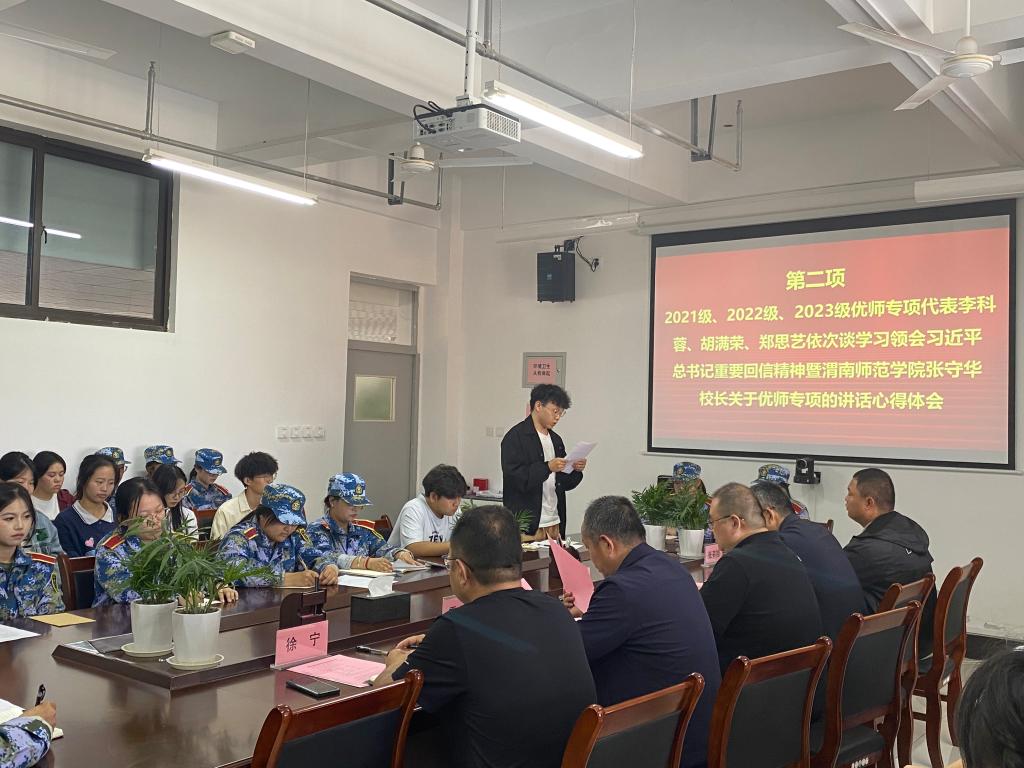 石海彬领学了习近平总书记给北京师范大学“优师计划”师范生重要回信精神和588888纽约国际线路张守华校长关于优师专项的相关讲话。部分学生结合实际畅谈了自身的学习感悟和体会。与会同学纷纷汇报了各自学习及生活情况,表达了毕业后到定向地区中小学服务的意愿和决心,并对课程设置及学习、生活中关心的问题提出了意见建议。