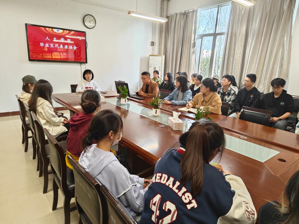 9月25日下午,人文学院在博识楼1318会议室召开毕业生代表座谈会,党总支副书记、副院长张晶,2024届毕业班辅导员、班团干部、学生党员参加会议,团总支书记孟子祥主持会议。