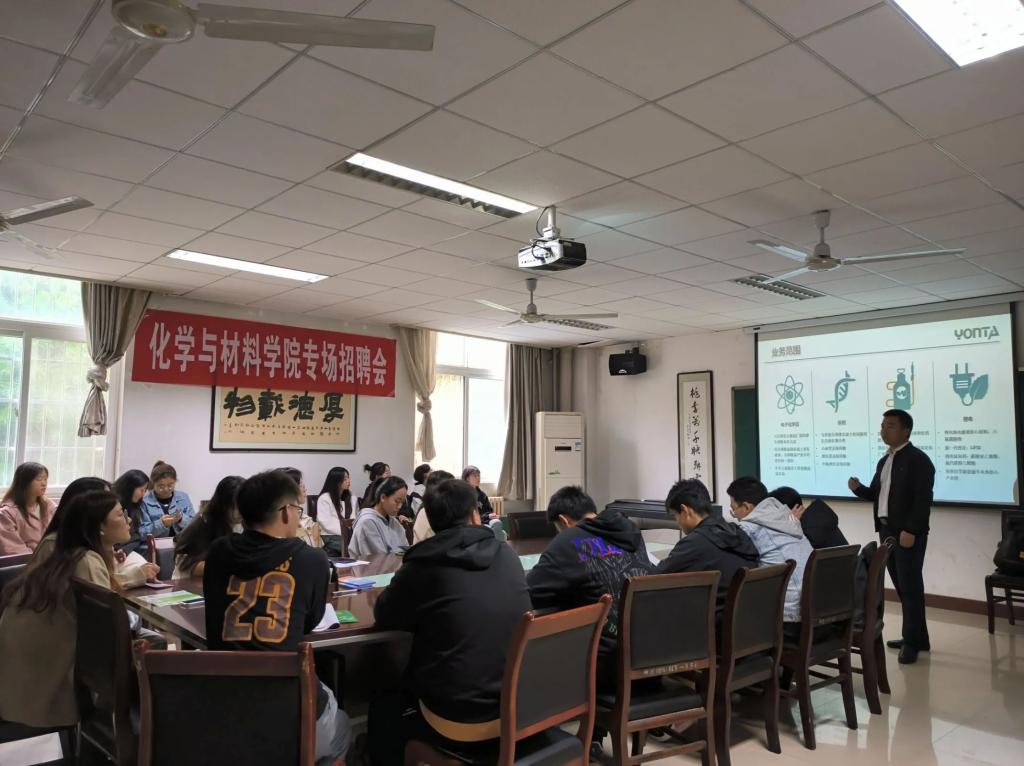 为了更好地拓宽毕业生的就业渠道,推进学院就业创业工作,10月11日,化学与材料学院邀请内蒙古永太化学有限公司、连州市凌力电池配件有限公司等为2024届毕业生举办宣讲招聘会,学院党总支副书记任晓婷、就业专干吴亮、毕业班辅导员张薇依以及毕业生共计50余人参加本次宣讲会。