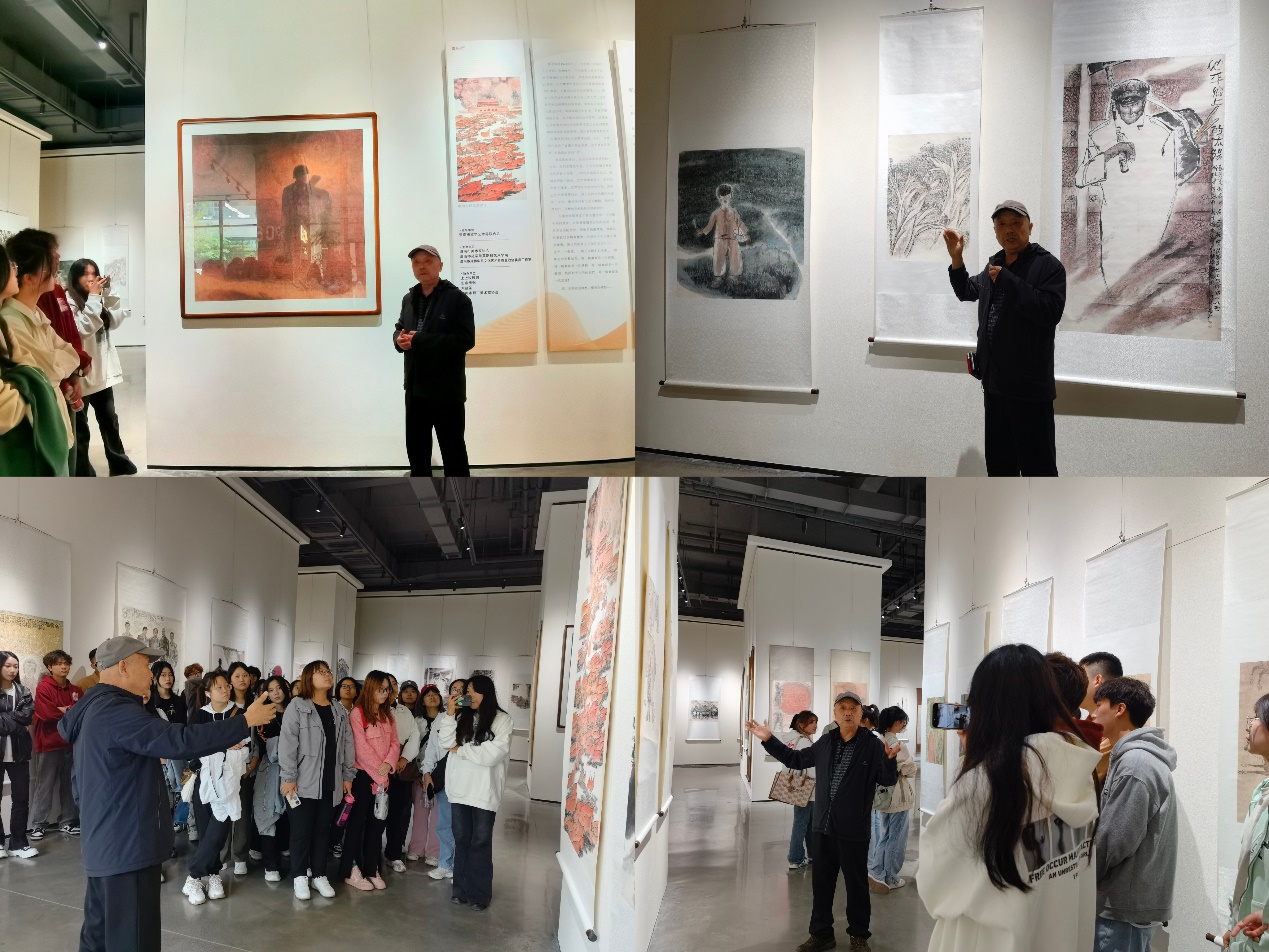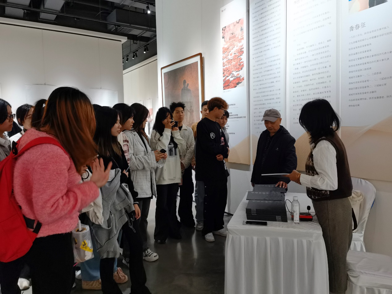 画展共展出乔春征79幅风格各异的人物画作品,展览作品主要以七八十年代的人物为创作主题,展现了乔春征早期人物画的艺术面貌。观展中,乔春征为在场的师生们详细讲解此次国画人物展的创作历程和绘画技巧,重点介绍了《在这片土地上》《阳光暖融融》《大太阳》等作品的创作故事。同时,他对中国人物画的题材、构图、色彩、笔墨等方面提出自己的艺术见解,与师生们进行探讨和交流。报告结束后,乔春征为学生们赠送了作品集,勉励学生今后在专业学习上不懈努力,创作出表现时代精神和人民生活的优秀作品。