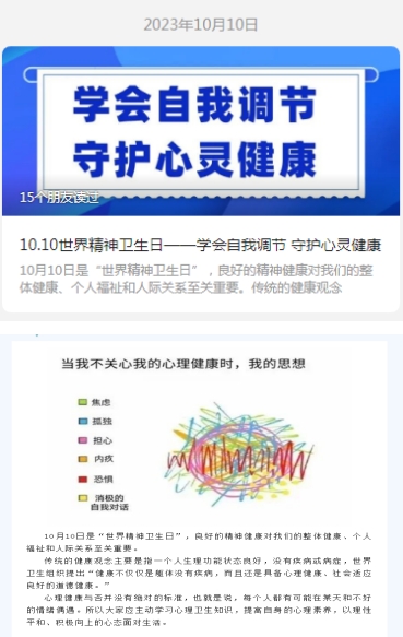10月10日,传媒学院在渭师院传媒院微信公众平台围绕世界精神卫生日开展主题宣传活动,通过线上平台普及心理健康知识及如何保持心理健康的建议,提升学院学生心理调适能力。