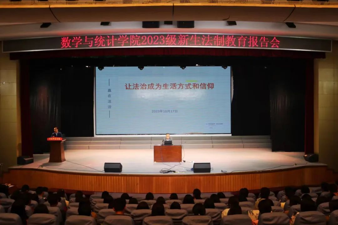 10月17日晚,数学与统计学院特邀屈琦教授在陶然楼演艺厅为师生作题为《让法治成为生活方式和信仰》法制教育报告。各班辅导员和340余名2023级新生参会,报告会由副院长赵教练主持。