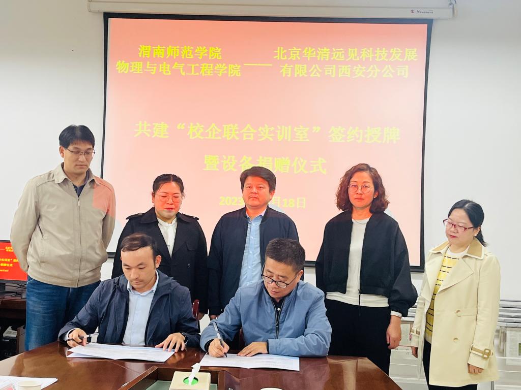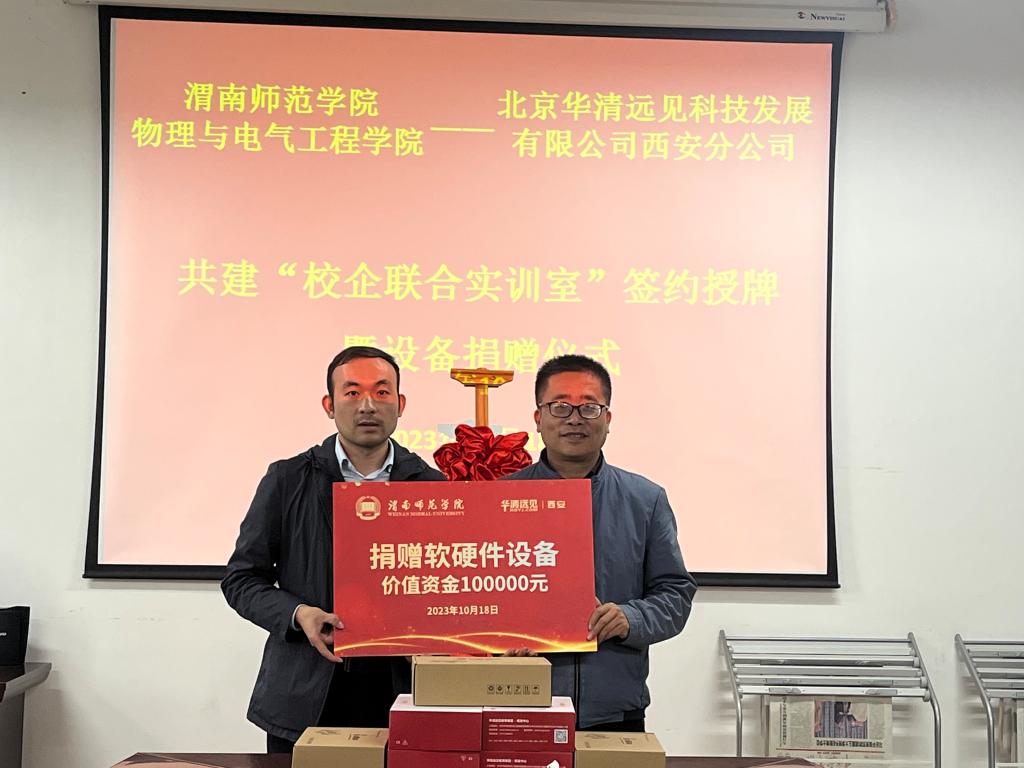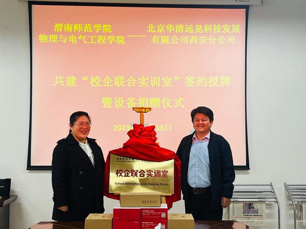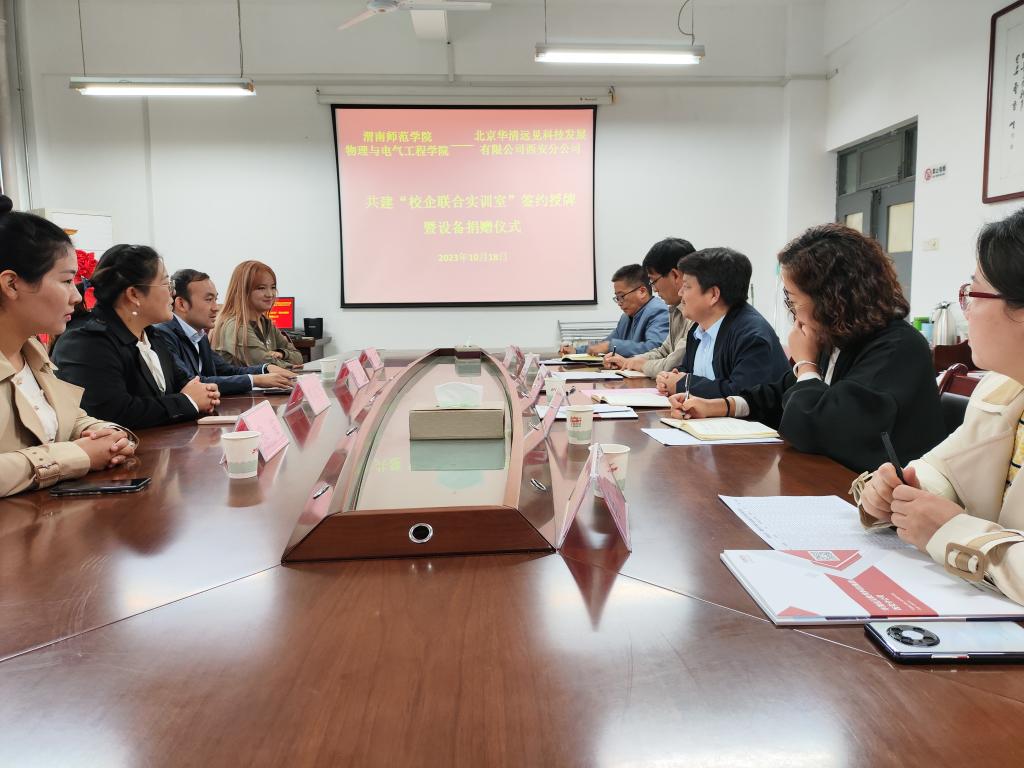 10月18日上午,北京华清远见科技发展有限公司西安分公司运营总监罗延飞、区域经理王康一行在物理与电气工程学院举行共建“校企联合实训室”签约授牌暨捐赠仪式。物理与电气工程学院院长袁卫、党总支副书记权轻舟、副院长张修兴、郭宝会以及电气系专业负责人参加了此次会议,会议由袁卫主持。