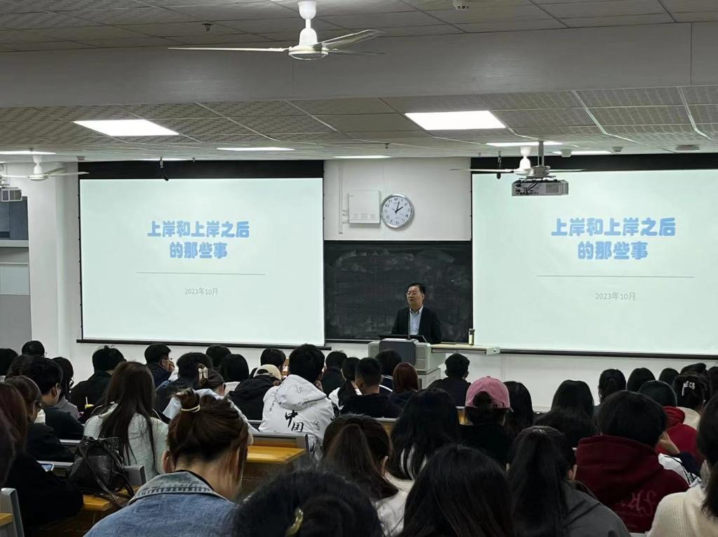 10月20日下午,经济与管理学院在1130教室举办主题为“上岸和上岸之后的那些事”的考公专题报告会。报告会由中共渭南市委副秘书长成宁军主讲。出席本次报告会的有学院党总支书记魏光民、学院副院长屈晓娟和2021级200余名学生。会议由辅导员兼团总支书记刘婉婷主持。