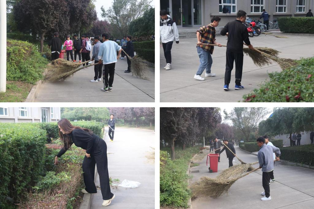 活动开始前,辅导员胡晋豫对清扫区域进行分工,闵雄飞副书记提出活动要求。大家对田径场周围的路面、绿化带等地方的落叶、随意丢弃的饮料瓶罐、塑料袋等垃圾进行了全方位清理。