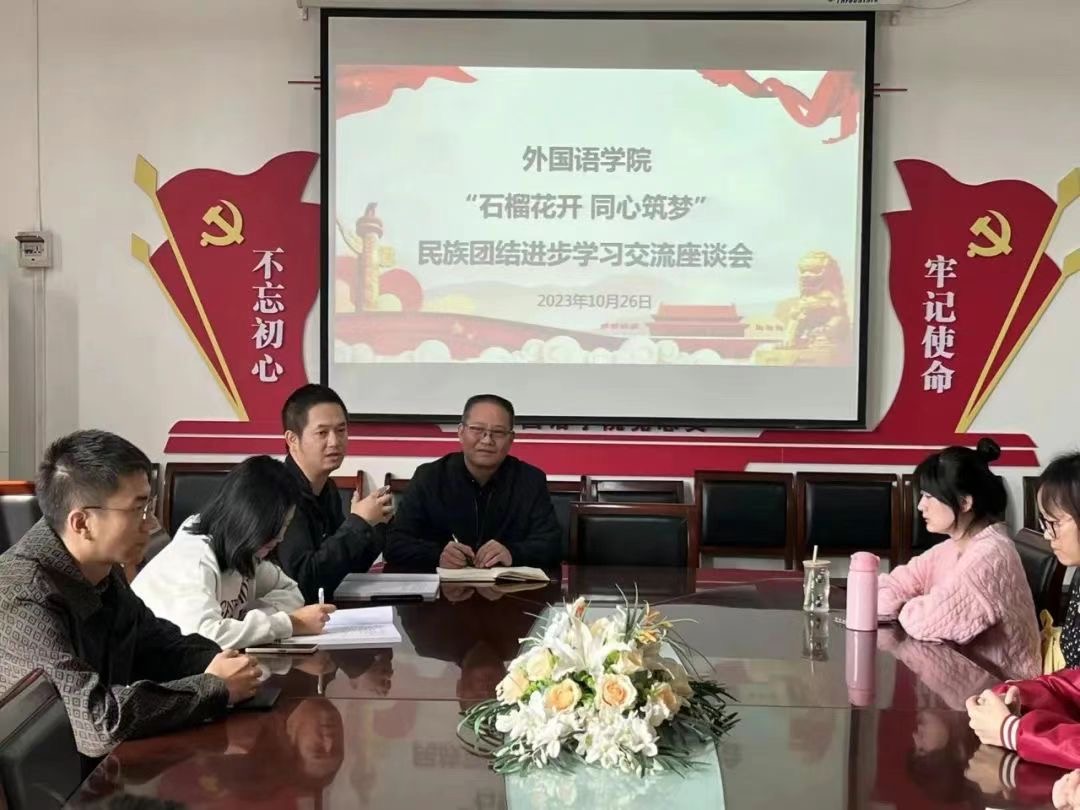 10月26日上午,外国语学院召开“石榴花开 同心筑梦”民族团结进步学习交流座谈会。外国语学院党总支书记吕健,学工办副主任敬菲菲,辅导员杜相宜、介梦萌及各民族学生代表参加座谈会,会议由敬菲菲主持。