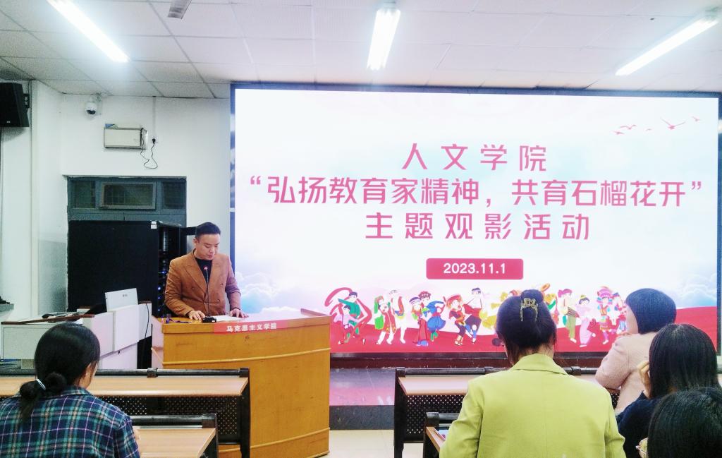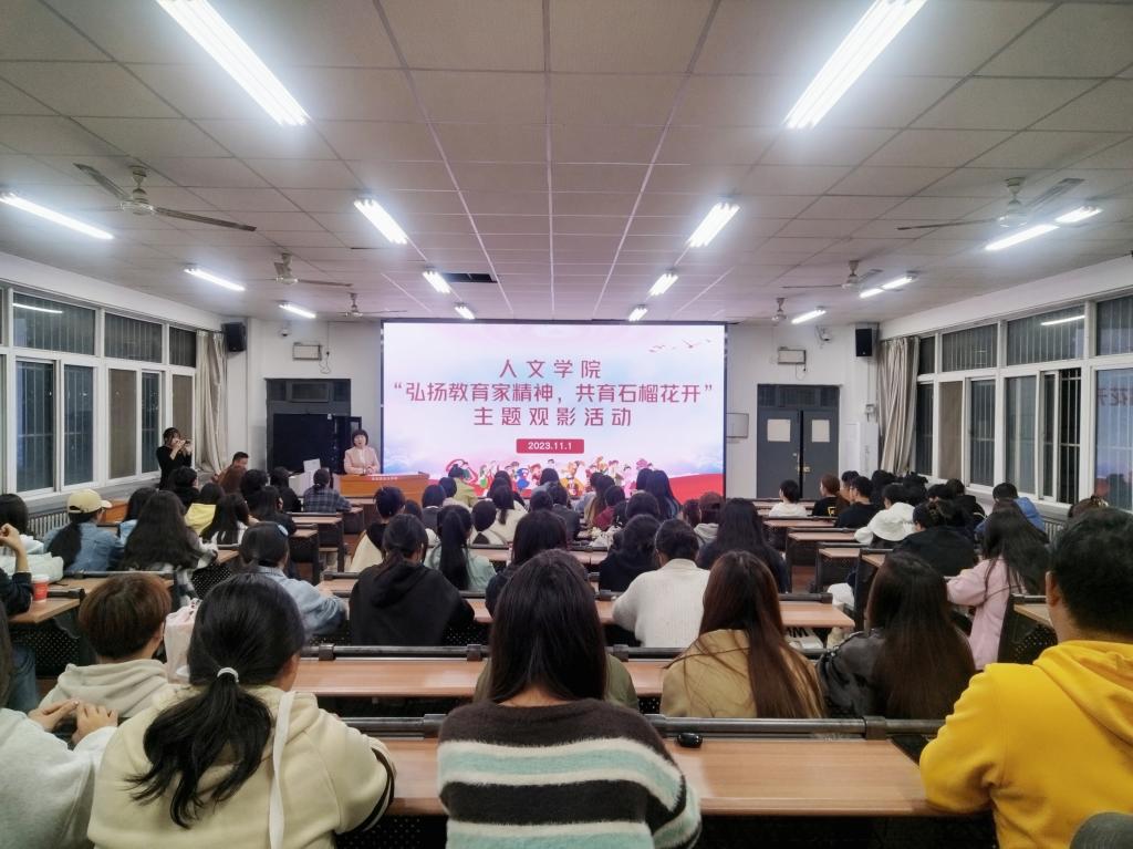 11月1日晚,人文学院开展“弘扬教育家精神,共育石榴花开”主题观影活动。党总支副书记、副院长张晶,全体辅导员,1-3年级少数民族学生、“优师计划”和免费师范生代表、学生干部代表、入党积极分子代表参加活动,团总支书记孟子祥主持活动。
