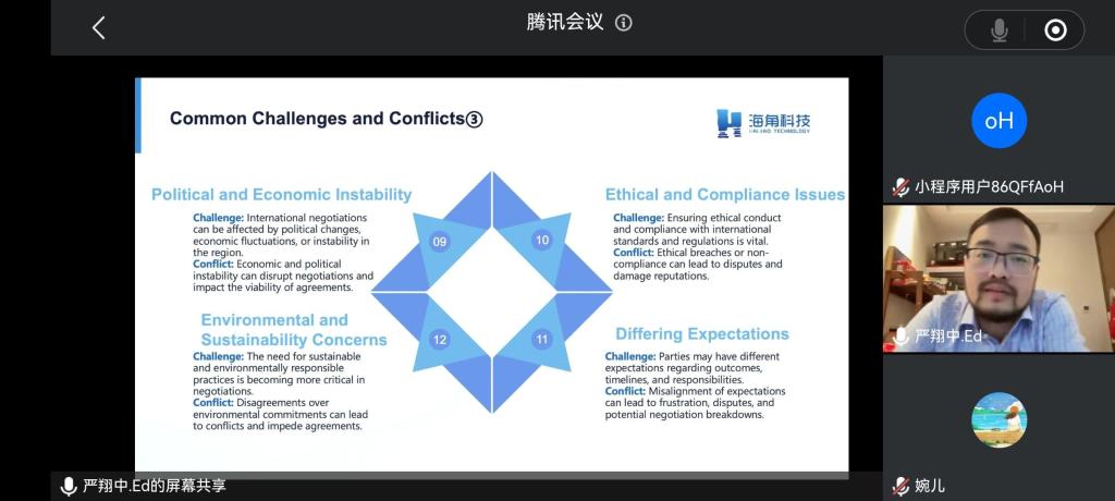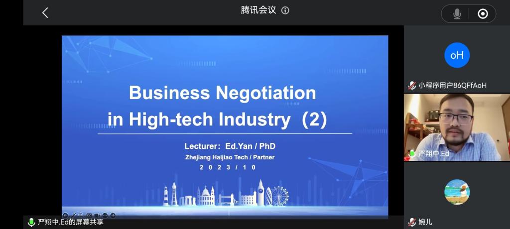 11月15日下午,外国语学院商务英语专业兼职教师严翔中博士以线上的形式为商务英语专业学生做了“商务谈判——高新技术产业”专题讲座,报告会由商务英语建设负责人唐琳主持,商务英语专业全体在校生参加。