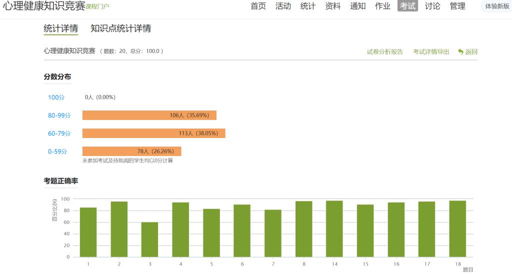 本次心理健康知识竞赛共有297名学生积极参与,比赛依托学习通平台,采取线上答题的方式进行,内容主要涵盖心理理论知识、心理保健常识、心理科普知识,及身心放松方法、积极心态建设等方面,集知识性、趣味性、教育性于一体。