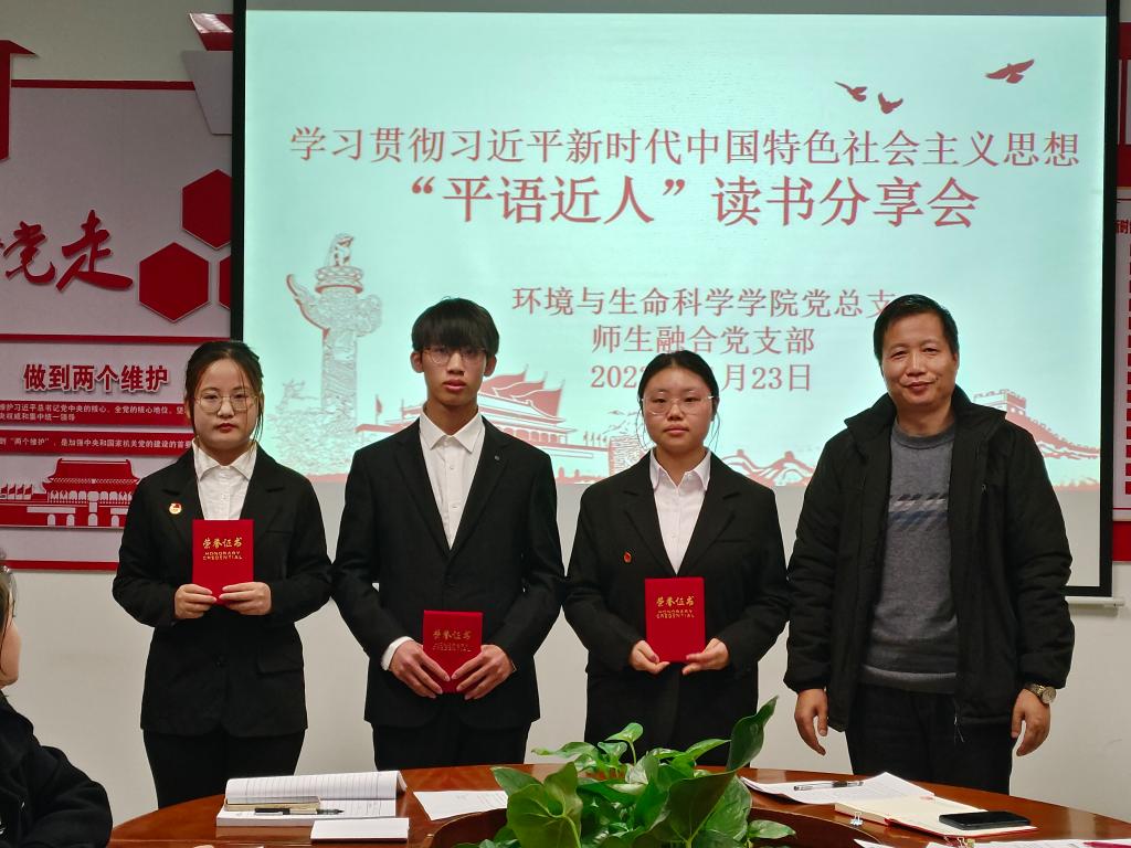 11月23日,环境与生命科学学院师生融合党支部在C212“初心固本”党员活动室开展以学习贯彻习近平新时代中国特色社会主义思想为主题的“平语近人”读书分享会。学院党总支副书记、副院长刘龙飞,党务秘书、师生融合党支部书记冯雨,团总支书记宋佳,专职辅导员朱忠盼、郭毓昕以及支部全体党员、入党积极分子等50余人参加。