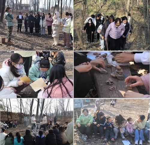 伟童幼儿园“漠里森林学校”的负责人田江涛对我院师生的到来表示热烈欢迎。随后,李园老师组织学生和幼儿围绕“森林”主题进行了一系列课程的设计、实践和反思活动。学前教育专业学生与伟童幼儿园的幼儿们一起参与了奇“石”妙想活动,享用了新奇的“森林野餐”烤红薯,进行了深度自然游戏体验,并以绘画和舞台剧等形式分享了“我的自然故事”。
