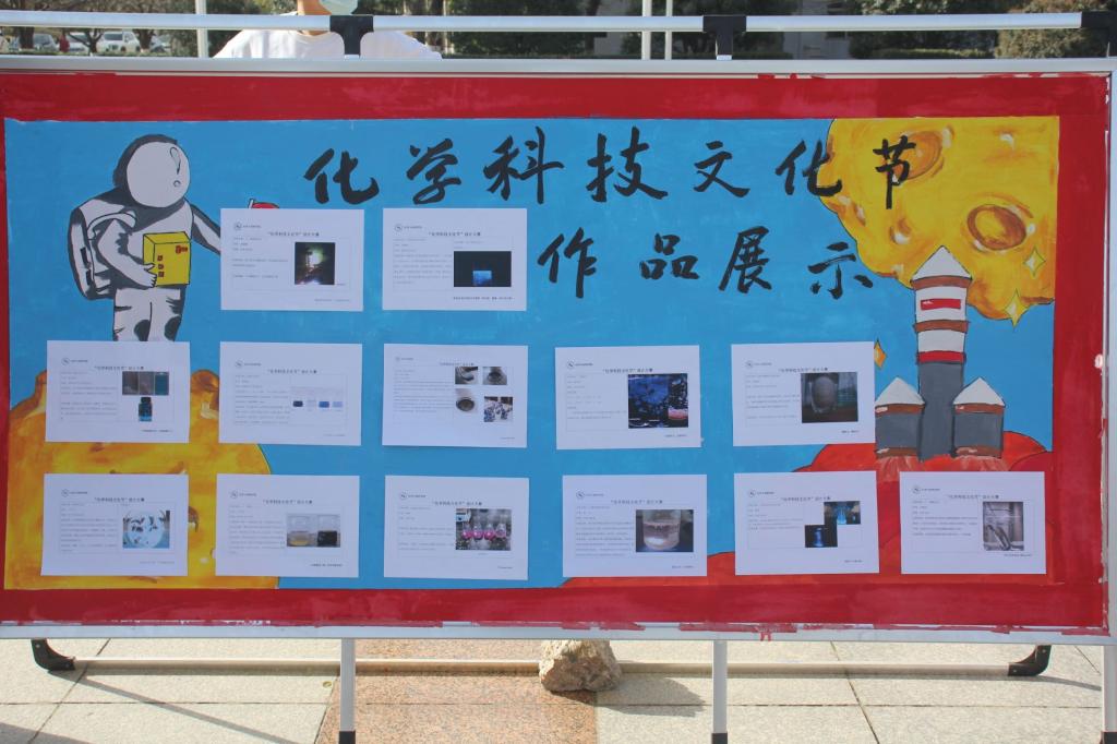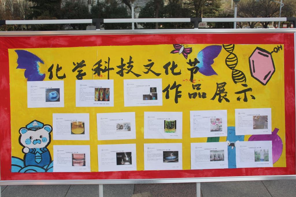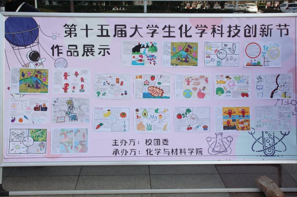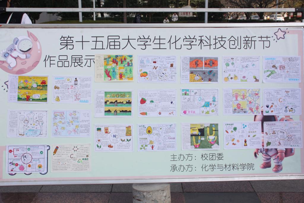 “多彩化学展”活动中, “变‘废’为宝”展区是对来自全校320余名学生的投稿作品进行评选,将优秀作品进行现场展出。 “多彩化学漫画”主要展出的是化材学院“星梦化社”成员的100余副作品,通过美术与化学元素的结合,运用生动的绘画语言直观展示微观的化学世界。