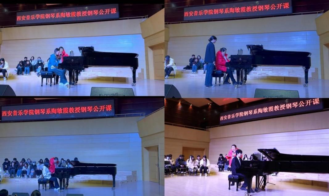 12月12日下午,举办陶敏霞教授钢琴公开课,此次钢琴公开课共三个环节,陶敏霞对我院4名钢琴主项学生代表进行授课,她从作品解读、演奏分析、触键技法、弱音控制、触键音色、钢琴演奏中的想象等方面对学生进行了耐心、细致的指导,通过生动的讲解配合示范演奏,使学生演奏能力有立竿见影的变化及提升。在问答环节,陶敏霞对学生学习中的困惑进行了逐一解答,并对学生今后的专业学习提出了建议。师生们最后围绕钢琴教学理念、教学质量、课程设置、培养目标等方面进行了深入交流。