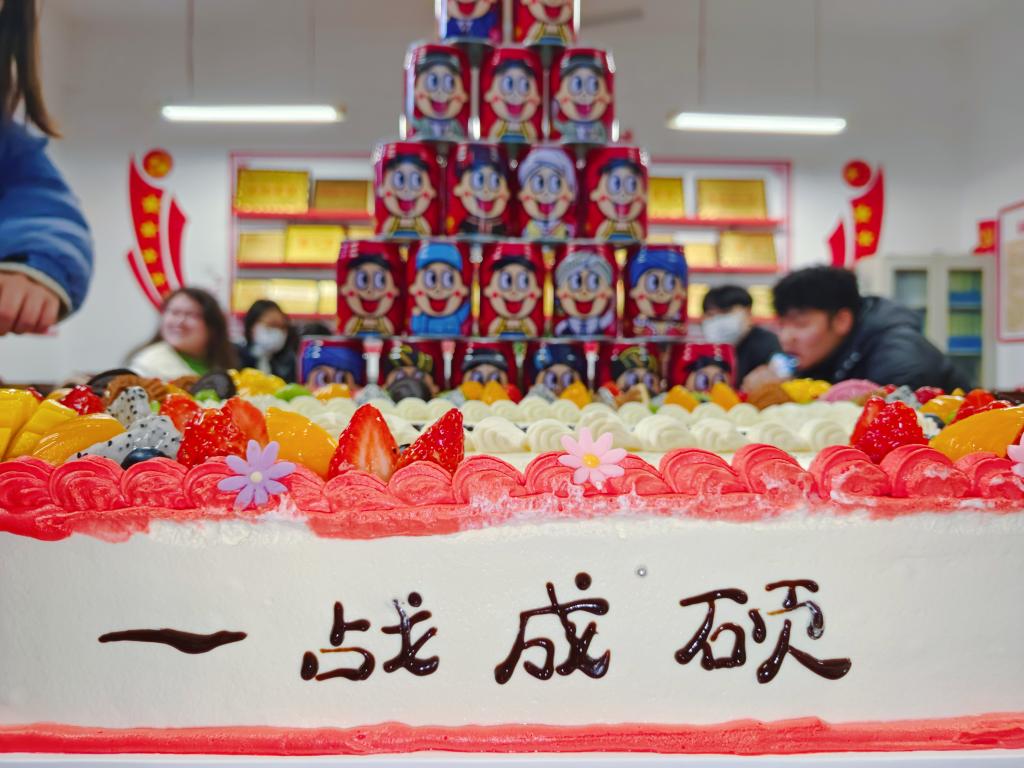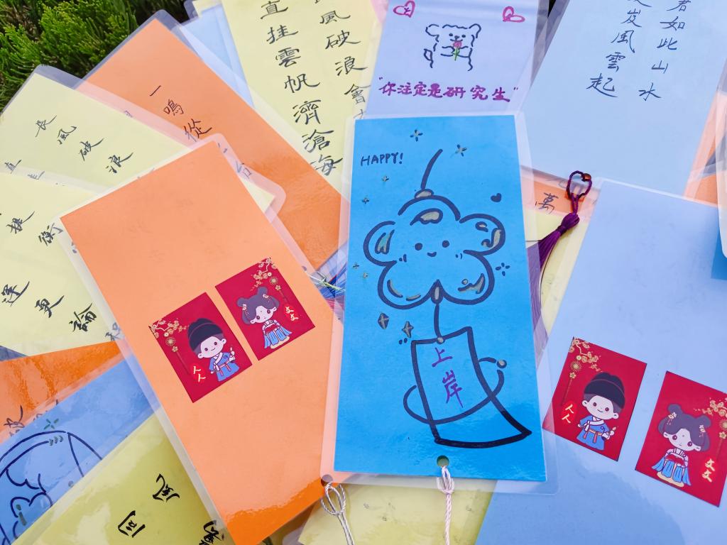 张晶介绍了学院为考研学子精心准备的“上岸”大礼包:老师用繁体字书写,来源于古诗词中的富有人文特色的书签:金鳞岂是池中物,一遇风雨化成龙;东风擢第上瑶京,金榜天门列姓名;一鸣从此始,相望青云端……还有寓意“牛气冲天”的旺仔牛奶,寓意“步步高升”的蛋糕,寓意“越来越棒”的棒棒糖,寓意“好运连连”的巧克力,寓意“大吉大利”的金桔以及考研必备文具。