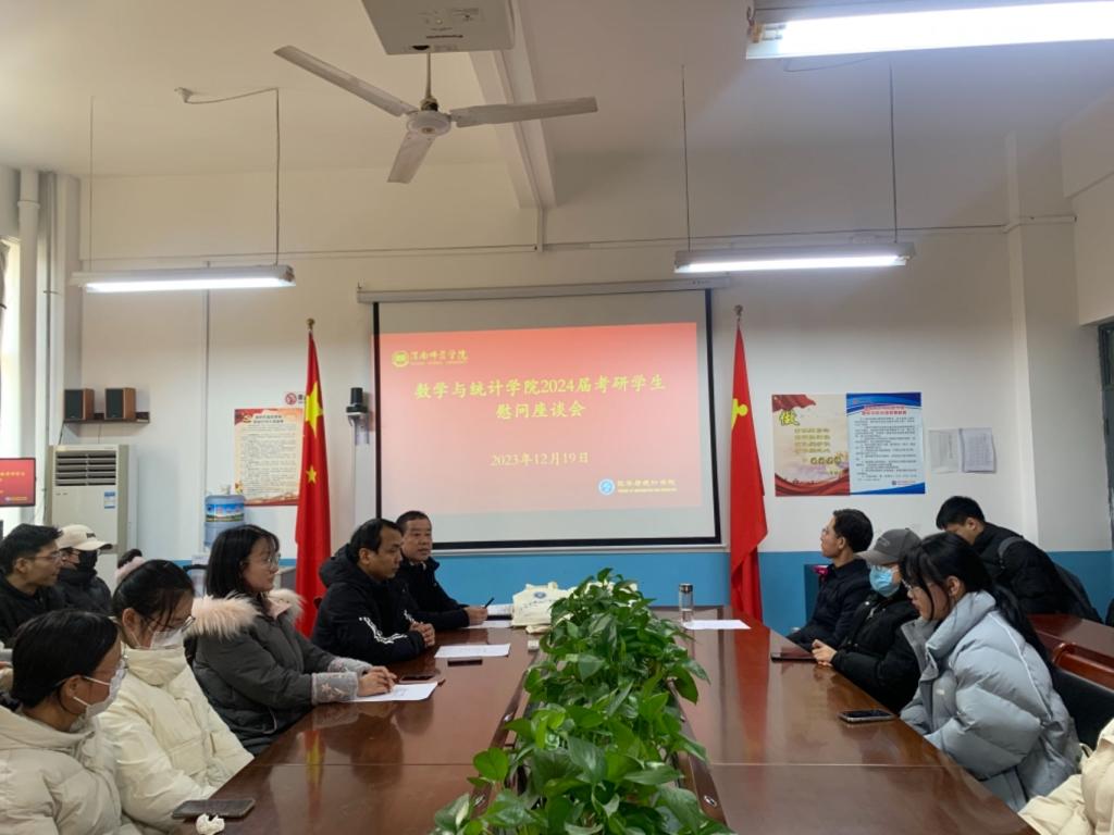 12月19日,数学与统计学院举行2024届考研学生慰问座谈会,旨在为即将参加全国硕士研究生招生考试的同学们送上鼓励与祝福,学院党政领导、毕业班辅导员、考研导师及部分考研学生参加,会议由副院长赵教练主持。