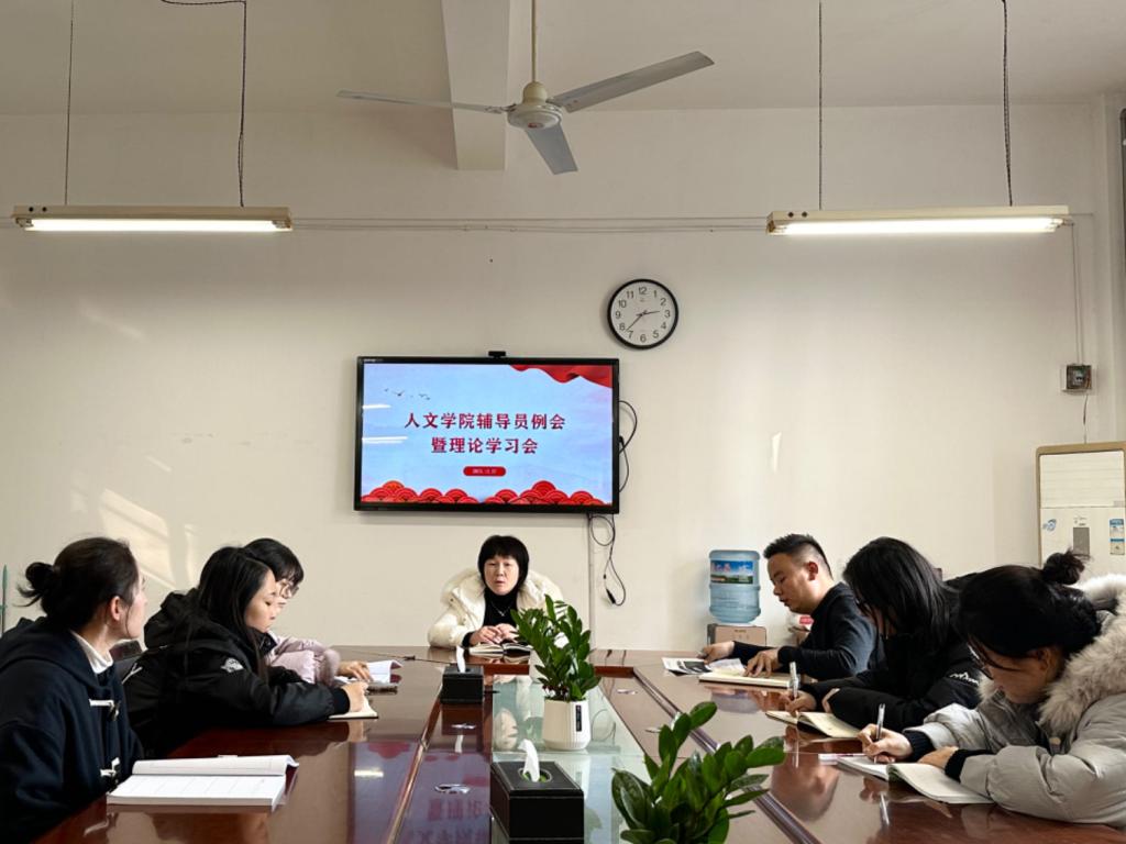 12月27日下午,人文学院在博识楼1318会议室召开辅导员工作例会暨理论学习会,党总支副书记、副院长张晶主持会议,全体辅导员参加会议。