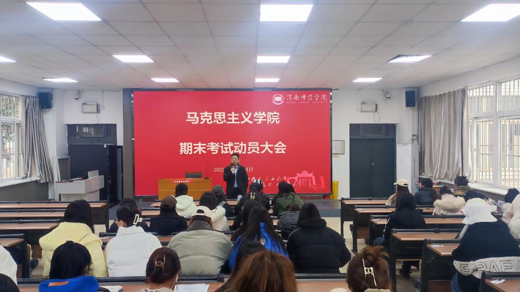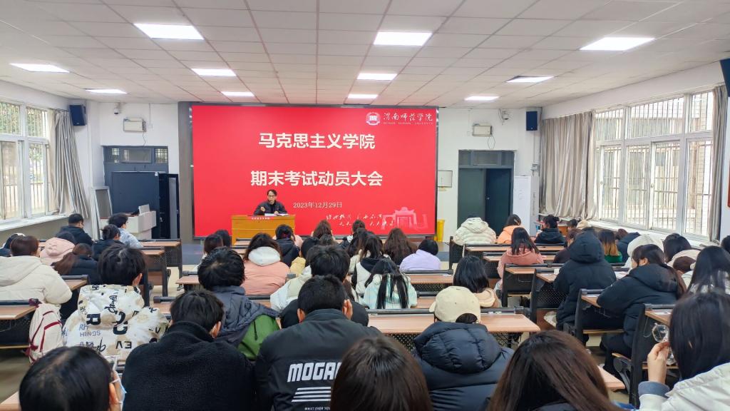 2023年12月29日下午,马克思主义学院处级干部分专业和班级在1101教室召开期末考试动员会,其中党总支书记赵国峰包联2021级学生、院长张萍包联2023级、副院长单剑峰包联2022级学生。