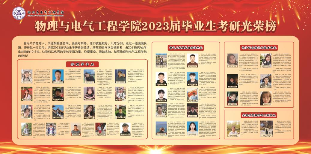 学院上下思想同频、行动同步,牢牢抓住“立德树人”这一根本任务,把学生考研作为人才培养的重要内容之一,充分发挥学院领导班子、专业课教师、辅导员等多支队伍的力量。针对2023届毕业生从考研动员、报名推荐、专业指导、压力疏导、后勤保障等方面提供帮助与指导,2023年共有35名同学考取硕士研究生,包括陕西师范大学、西安理工大学、南京邮电大学等多所重点高校,占2023届毕业学生总数的10.6%。
