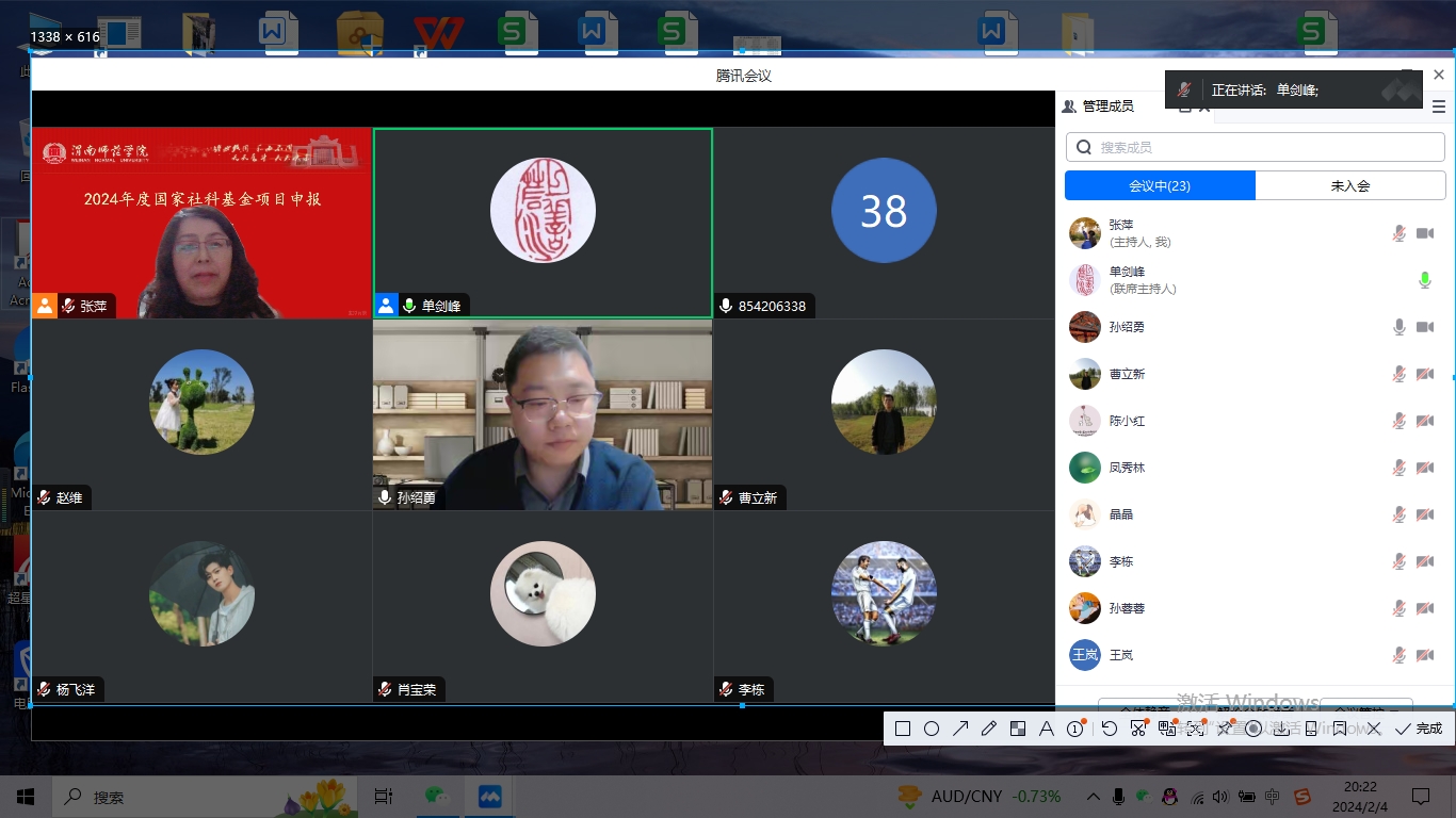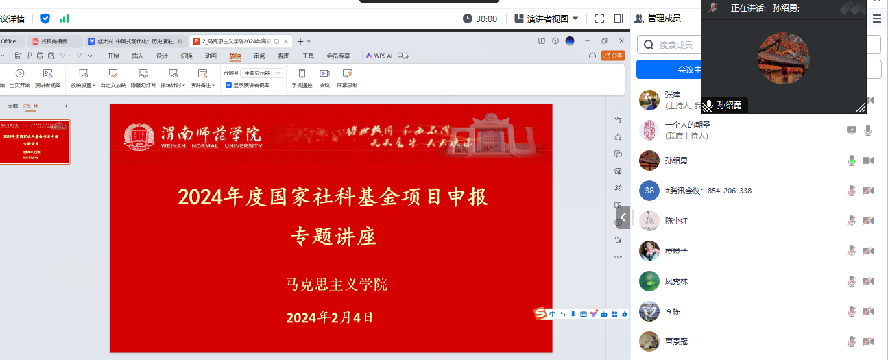 为进一步加强有组织科研工作,切实提高高级别项目申报质量,2月4日,马克思主义学院邀请西北工业大学马克思主义学院的孙绍勇教授作题为《国家社科基金项目申报的总体要领》的报告,报告会采用线上方式进行,马克思主义学院院长张萍和30多名教师参加。单剑峰主持。