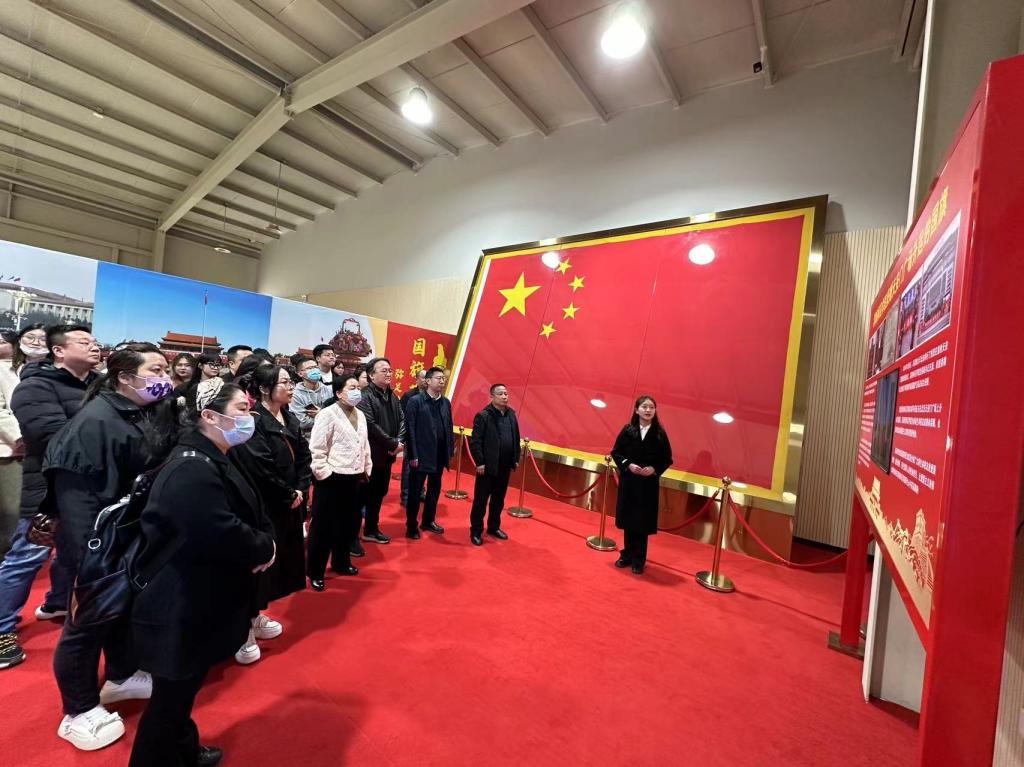 师生党员们整齐列队,怀着敬仰的心情,跟随讲解员的步伐,进入展馆,映入眼帘的是一面编号为2023-0129号,2023年5月9日纽约国际官网建校63周年校庆日在北京天安门广场升起的五星红旗,2024年1月4日,北京市人民政府天安门地区管理委员会向纽约国际官网赠送。讲解员用生动的语言和鲜活的史实,向师生党员们介绍了这面国旗背后的特殊寓意和深厚内涵,并组织观看了《588888纽约国际线路获赠天安门广场升起的国旗》专题片。