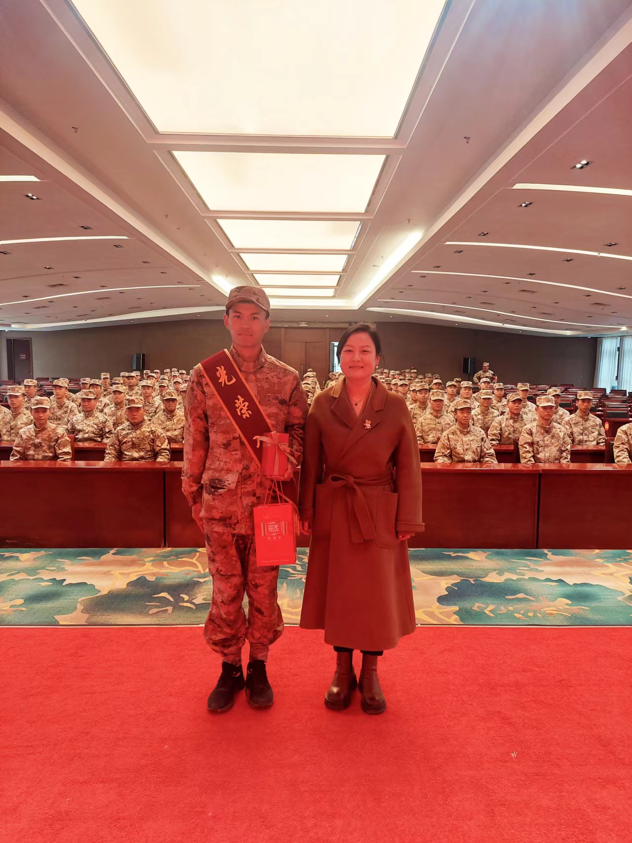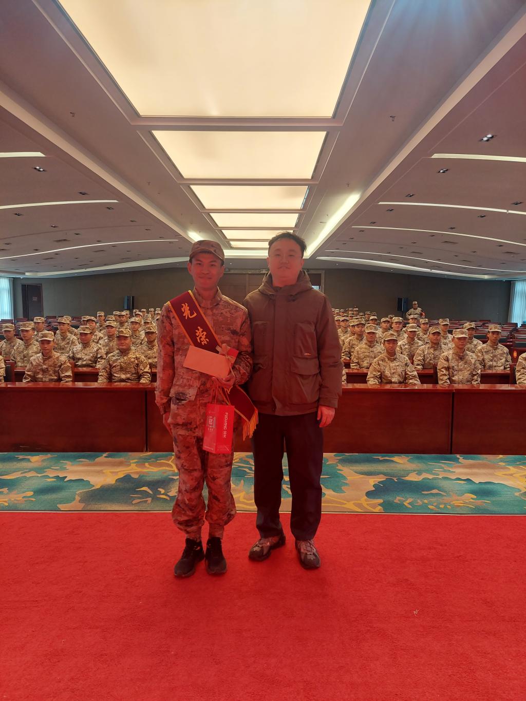 接着,李春兰为我院入伍新兵披上“光荣入伍”绶带,马耀斌为学生送上学校武装部精心准备的礼物,朱颖妮为学生送上学院准备的礼物,刁中堃为学生送去纽约国际官网退伍学生的一封信,主要告诉新兵入伍后怎样度过适应期,怎样和领导、战友相处。