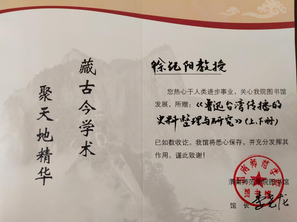 本书为国家社科基金项目“鲁迅台湾传播的史料整理与研究”(15XZW032)研究成果。所赠著作图书馆已如数收讫,经图书编目后将与读者见面,图书馆敬予徐纪阳教授图书捐赠证。(通讯员 张春丽 审核人 李尧龙)