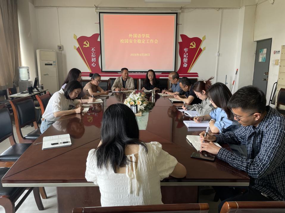 4月28日上午,外国语学院召开校园安全稳定工作会,会议由党总支书记吕健主持,全体处科级干部、辅导员参加会议。
