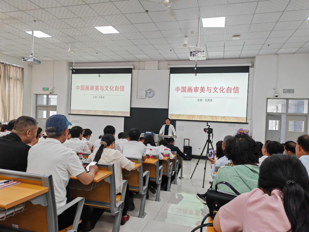 观展后,王西京进行了一场题为《中国画审美与文化自信》的学术讲座。首先梳理了中国美术教育的发展简史,接着通过中西对比的理论构架深入阐述了中国画的审美特征。他指出,中国画独特的线条、笔墨语言、构图方式和色彩运用,不只是对工具材料的简单应用,更是画家对自然、人生、社会的深刻理解和感悟,体现出中国传统文化中“天人合一”的哲学思想。同时,王西京先生结合自己创作《春潮》《黄河,母亲河》等重大题材作品的实例,分享了他在中国画创作选题立意、素材搜集、章法布局、技法表现等方面的经验,并对一名画家所应具备的综合素养、生活积累、文化自觉自信等方面问题进行了阐述,特别强调了中国画所蕴含的文化内涵和价值观念。他认为,中国画不仅是对自然美的再现,更是对人性、情感、道德的抒发和表达,这种表达方式,正是中国文化自信的重要体现。