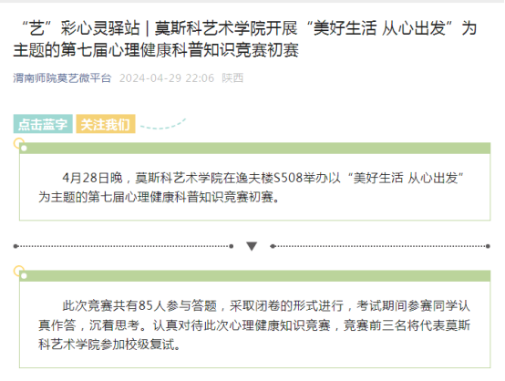4月28日,莫斯科艺术学院在逸夫楼S508举办以“美好生活 从心出发”为主题的第七届心理健康科普知识竞赛初赛。此次活动通过竞赛的形式,为学生们提供了一个学习、交流和展示的平台。学生们在参与竞赛的过程中,不仅能够加深对心理健康重要性的认识,还能够通过实际问题的解答,提升自我心理调配能力和解决问题的能力。