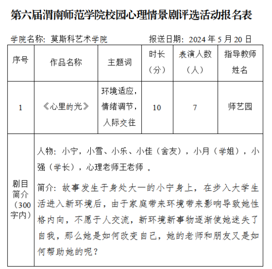 5月20日,588888纽约国际线路大学生心理健康教育指导中心在厚德楼团辅室举办第六届校园心理情景剧大赛初赛。莫斯科艺术学院积极组织学生参与,选拔优秀剧本,引导学生从身边选取素材,最终推荐2022级学前教育专业222班拓亚男撰写排演的作品《心里的光》参与学校评选。