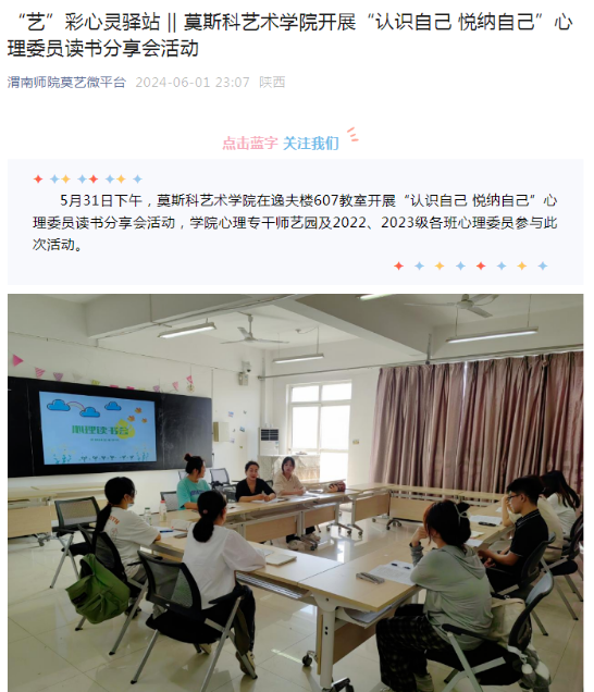5月31日,莫斯科艺术学院在逸夫楼607教室开展“认识自己 悦纳自己”心理委员读书分享会活动,学院心理专干师艺园及2022、2023级各班心理委员参与此次活动。此次读书分享会引导同学们关注自我心理健康,以更加积极的心态面对生活中的挑战,勇敢地追求自己的梦想。