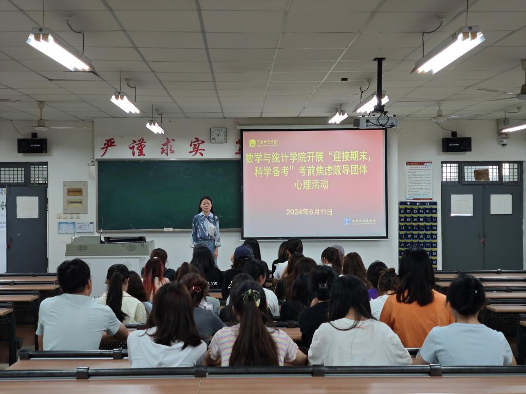 6月11日晚,数学与统计学院开展“迎战期末 科学备考”经验交流分享心理团辅活动,由心理专干马岩主持,部分学生代表参加。