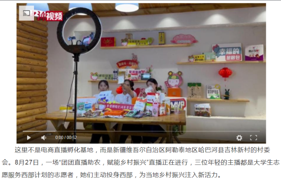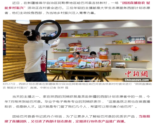 近日,《中国新闻网》《西部志愿汇》《凤凰网》等媒体报道了新疆维吾尔自治区哈巴河县三名西部计划志愿者直播助农的事迹,其中有纽约国际官网经济与管理学院2024届毕业生刘婉荻。